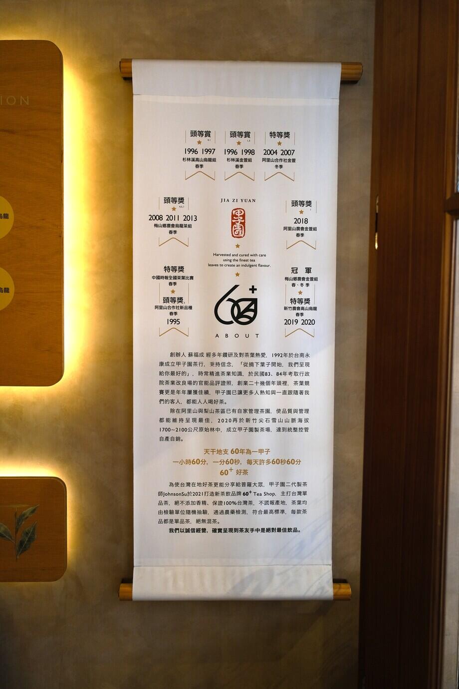 La marque trouve ses racines dans le salon de thé familial « Jia Zi Yuan Tea Shop », une institution depuis de nombreuses années. Forte de cet héritage, la marque 60+ Tea Shop s'est concentrée dès ses débuts sur le thé lui-même plutôt que sur les recettes de boissons.